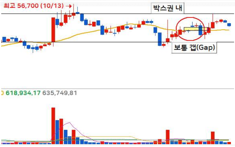 하루 장이 열리는 시간 동안 매수세 VS 매도세 가 전투를 치르면서 한쪽이 밀리는 경우 발생하는 일반적인 갭으로써, 보통 박스권이나, 매물대 아래에서 횡보하는 구간에서 등장하는 갭입니다.