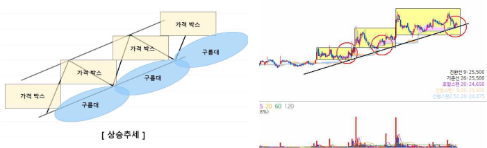 주가 상승추세는 대부분이 강세국면에서 이뤄집니다. 상승추세 구간에서는 가격박스들이 ‘계단식 상승’을 형성되는데, 이때 구름대 또한 같이 계단식으로 상승을 하게 됩니다. 우리는 스윙트레이딩에 있어서 주가가 일목균형표 위에 존재할 때, 즉 강세 국면에서 눌림을 잘 공략하여 매매를 하는 것이 좋습니다.