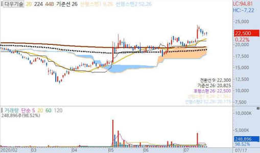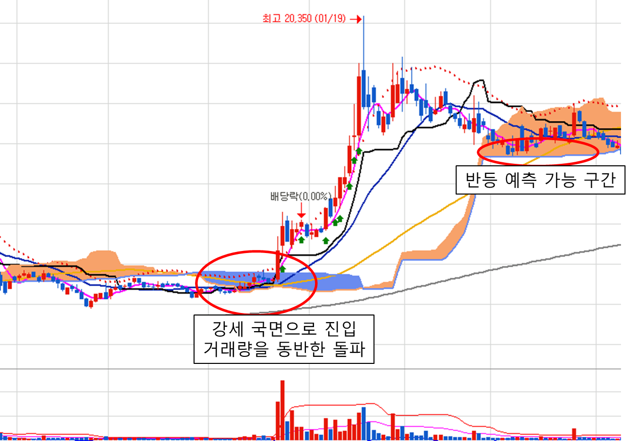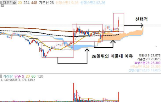 그리고 거래량이 터지는 기준봉이 출현을 합니다. 차트를 보게되면 기준봉 출현 이후 약 5거래일 간의 단기 조정 박스를 형성하게 되는데, 이때 26일 뒤에 일목균형표 구름대가 선행적으로 표시됩니다. 이후 주가 조정이 오더라도 선행적으로 표시된 구름대가 지지대로 인식되어 반등이 나올 가능성이 높다는 예상을 해볼 수가 있습니다. 이후 지속 조정을 하던 차트가 구름대 영역에서 반등이 나온 것을 확인 해볼 수 있었으며, 만일 다시 구름대 구간을 주가가 이탈했다면 다시 약세국면의 진입을 하는 것이기에 손절의 관점으로 지켜보면 되는 것입니다.