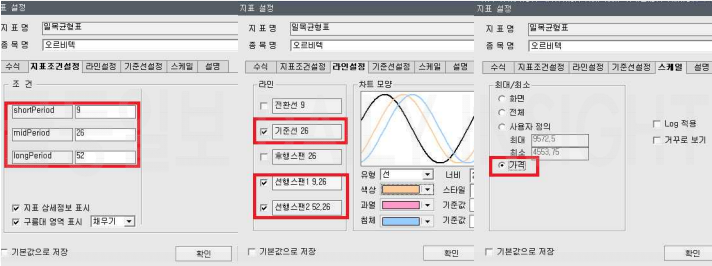 수치는 기본적인 shortPeriod 9, midPeriod 26, longPeriod 52 설정, 라인은 선행스팬1, 선행스팬2, 기준선만 설정, 스케일에서는 ‘가격’에 체크를 해둡니다.