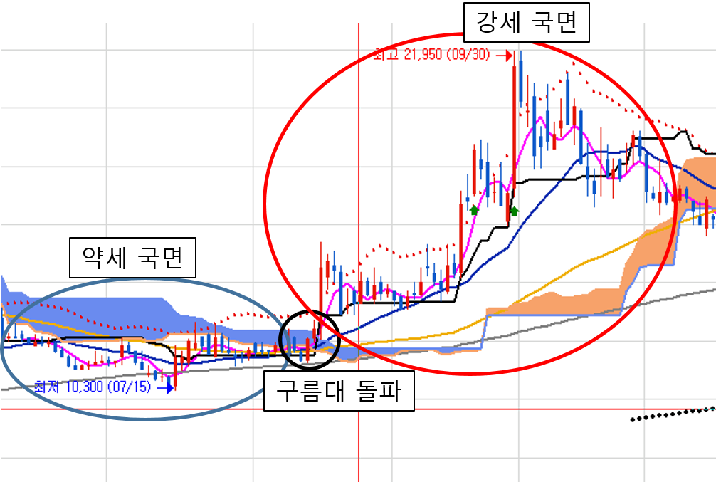 주가가 구름대 위에 위치 하는 경우, 아래 매물대를 지지삼아 움직이는 주가는 ‘강세국면’ 에 있다고 하며, 주가가 구름대 아래에 위치하는 경우, 위로 매물대를 저항삼아 움직이는 주가는 ‘약세국면’ 에 있다고 합니다.
