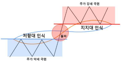 주가의 흐름이 매물대(구름대)를 돌파함으로써, 주가는 강세국면으로 진입합니다.