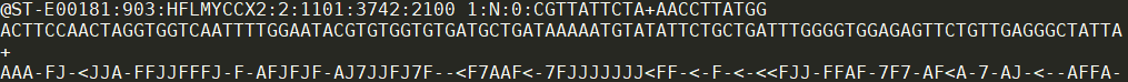 현대 사회에 들어서 시퀀싱을 하는 방법이나 시퀀싱을 돌리는 기계는 발전을 많이 했는데, 이 중 가장 대표적이라고 할 수 있는 Illumina사의 시퀀싱만 우선 알면 될 것 같습니다. 어찌 됬든 시퀀싱을 했다고 치고, 시퀀싱 결과인 FASTQ 파일을 들여다보면 아래와 같습니다.