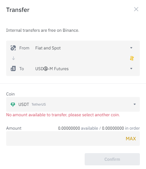 위 그림처럼 From에는 Fiat and Spot을 선택하고 To에는 USD-M Futures를 선택하자. Futures라고 되어 있는 게 선물계정이다.