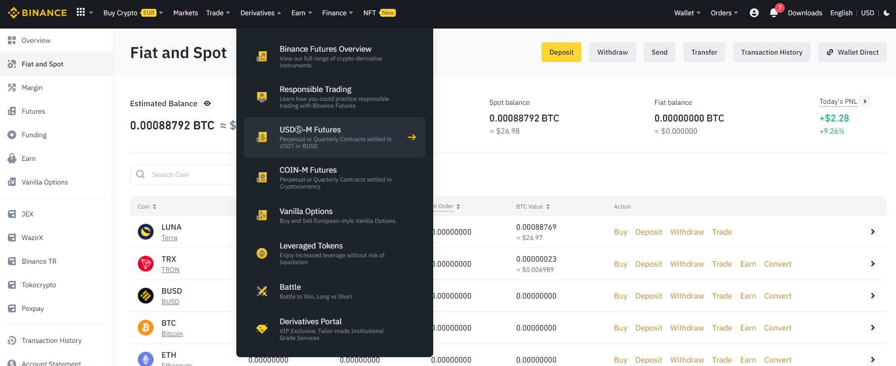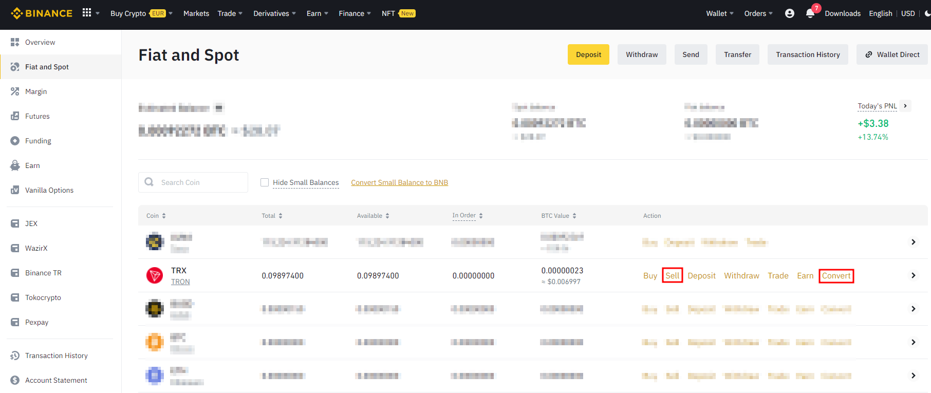바이낸스의 상단의 Wallet에서 Fiat and Spot 으로 가면 자신이 보냈던 트론이 있는 것을 확인할 수 있다.