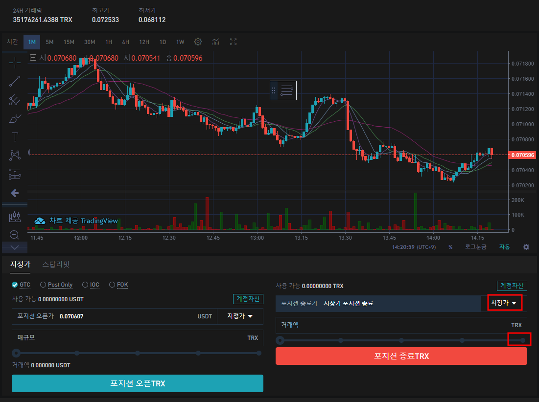 그럼 위와 같이 매수 또는 매도할 수 있는 탭이 나오는데, 우리는 여기서 빨간 네모와 같이 시장가를 선택하고 그 아래 빨간 네모 부분을 눌러서 100% (팔려고 하는 최대)를 선택한 다음 포지션 종료를 해주자.
