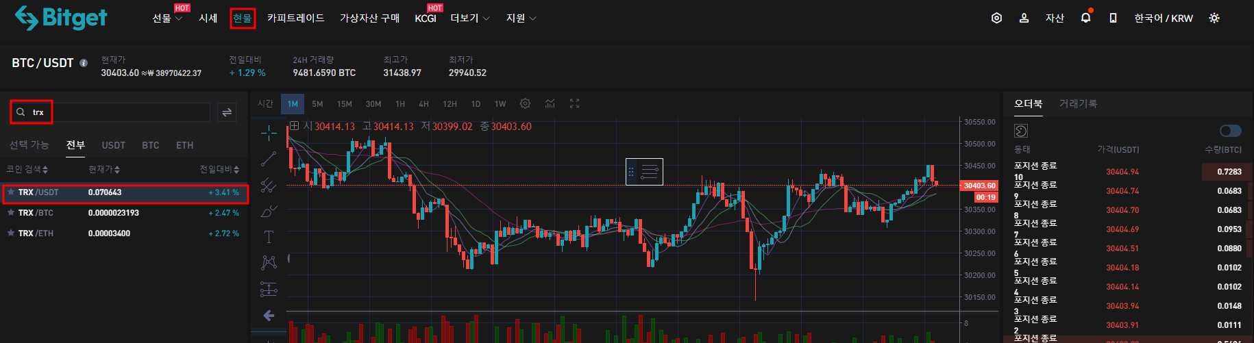 먼저 USDT를 얻어야 하니, 비트겟 상단의 현물 탭에서 내가 보낸 코인인 TRX (트론)을 검색한다. 그중에서 뒤쪽이 USDT라고 되어 있는 것을 선택해서 진행한다.