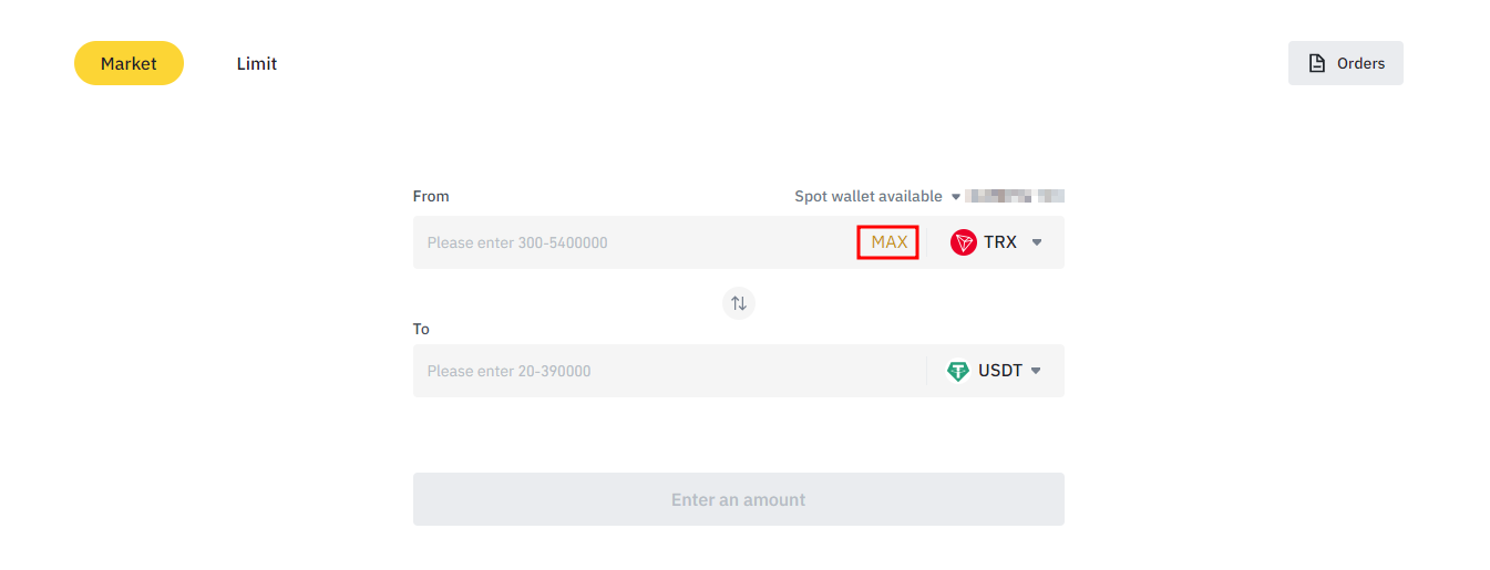 자, 보면 From~ To로 표기되어 있다. 어떤 코인을 어떤 것으로 바꿀 것이냐 라는 의미이다. 우리는 TRX (트론)을 가지고 있으니, 위쪽을 TRX로 선택하고 아래는 USDT를 선택한다음 MAX를 눌러서 모두 바꿔보자.