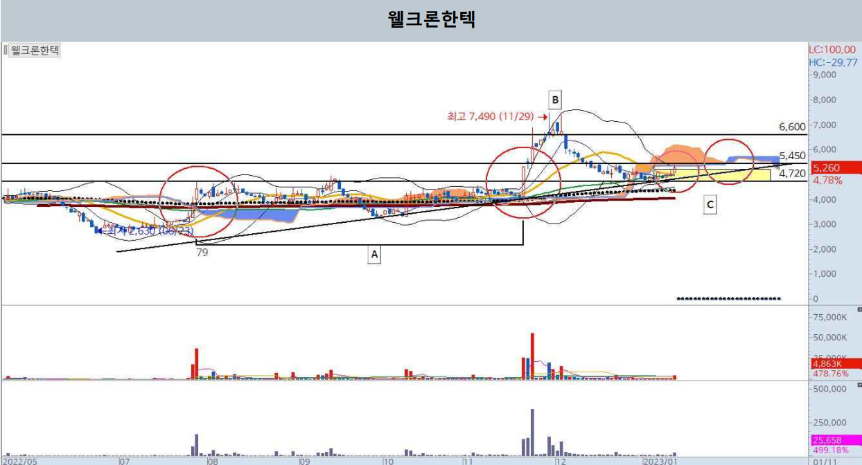 2차 전지 관련(폐배터리 및 장비) , 네옴시티 관련(식수망공급)주로 엮여있는 웰크론한텍입니다. 현재 기준봉을 포함한 상승파동을 출현시키고 신고가 영역을 달성한 후 손절자리가 짧은 눌림목을 형성하고 있습니다. 흐름을 한번 참고해서 살펴보세요.