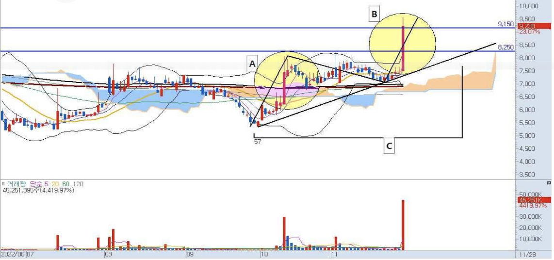 A 구간에서는 224/448일 지수 이동평균선, 일목균형표 구름대를 돌파하는 ‘돌파 기준봉’의 출현이었습니다. 그리고 볼린저 밴드는 발산 구간으로 진입을 합니다.